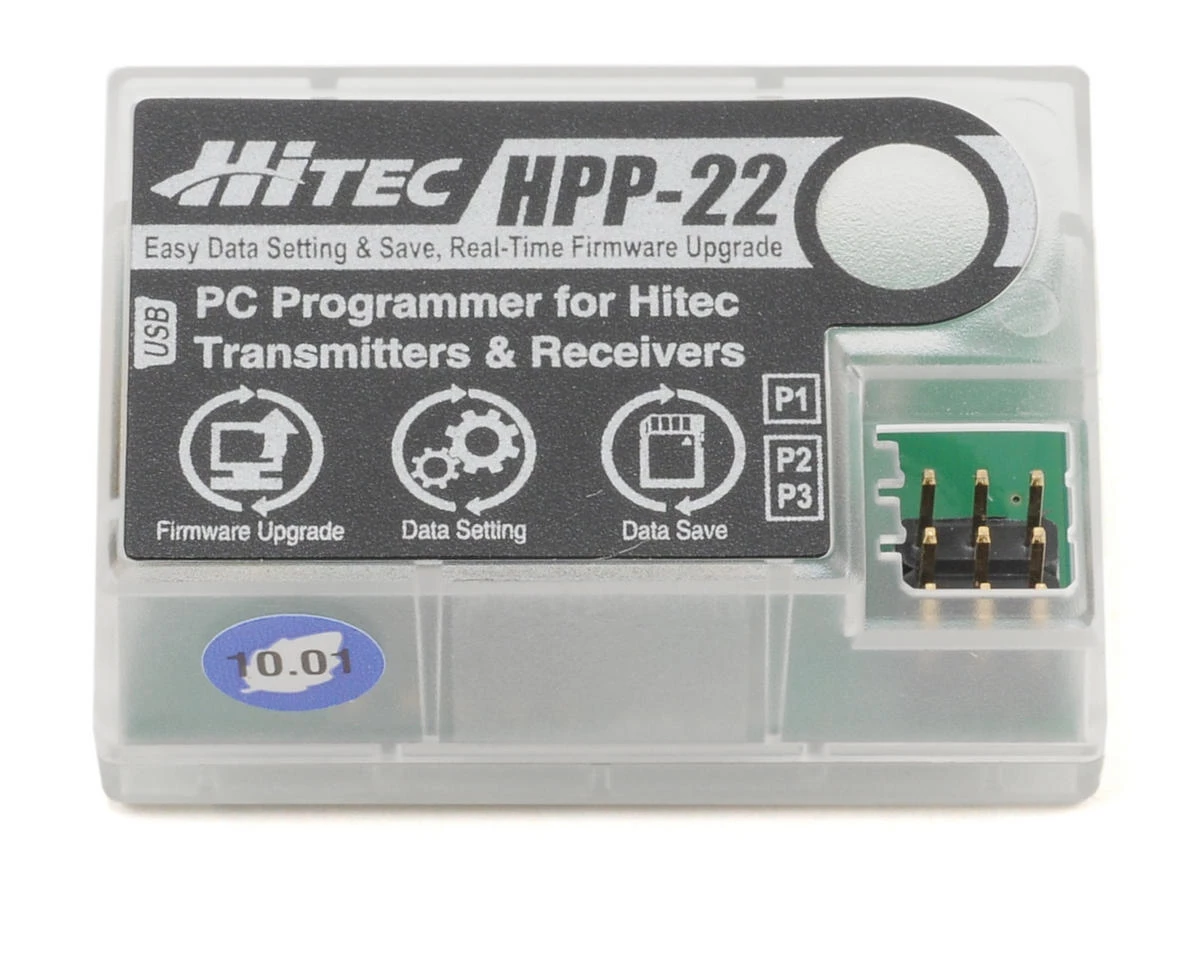 This is the Hitec HPP-22 PC Interface Programmer. The HPP-22 is the perfect companion to the Hitec 2.4GHz system and 2.4GHz radios. The versatile HPP-22 can be used to program your radio, Spectra 2.4GHz Module or Optima series of receivers. Other features allow you to save the setup data to your PC and update the software and firmware.