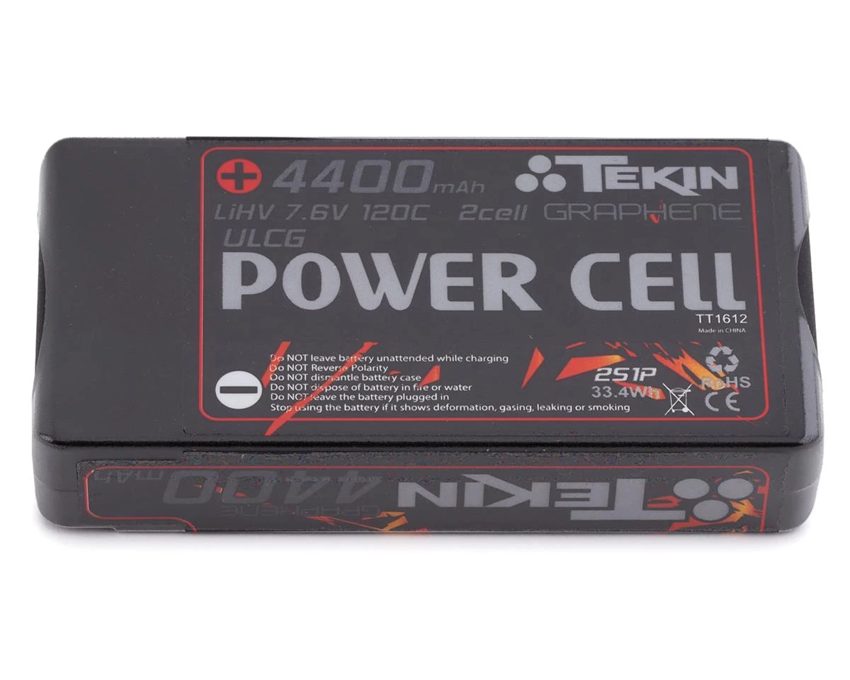 Tekin Power Cell 2S Hard Case ULCG Shorty 120C Graphene LiPo batteries are High Voltage capable, increasing both the energy density of the cells and the end voltage. Charging your packs up to 4.35V per cell yields more punch due to the higher voltage as well as increased pack capacity, giving your 1:10 buggy, truck or car longer run time. Experience more power and less fade during a run with HV POWER CELL battery packs.